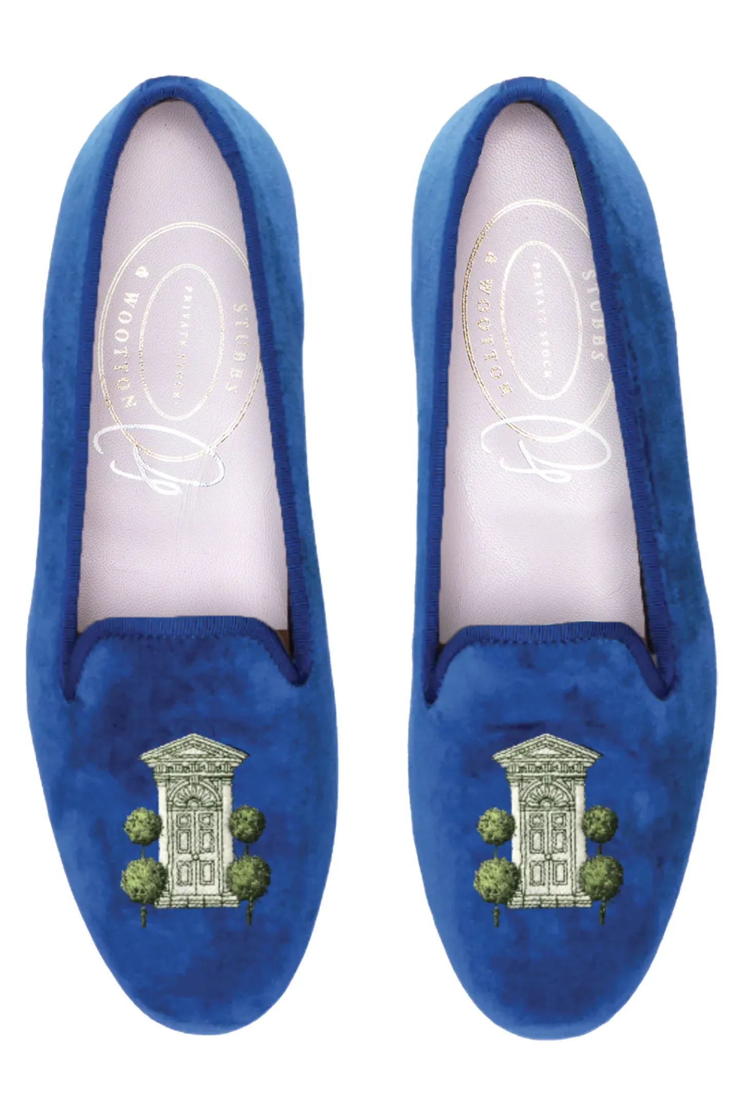 For nearly half a century, the Kips Bay Decorator Show House has been the standard bearer for all things exquisite, creative and innovative in interior design. Celebrate this convention of haute décor while also supporting the extraordinary initiatives of the Kips Bay Boys u0026amp; Girls Club with an exclusive pair of Stubbs u0026amp; Wootton’s stylish slippers embroidered with the Kips Bay Decorator Show House’s signature front door! Our Kips Bay Cobalt slipper features a Cobalt Blue Velvet Upper with a Cobalt Blue Grosgrain Trim. Finished off with KB Dallas door embroidery. Meticulously Hand-crafted in Spain. Leather lined to provide additional support and comfort. The stacked wooden heel is 3/4″ in height. Leather soled. True to American sizing. Made-to-Order – Shipping in 6-8 weeks.