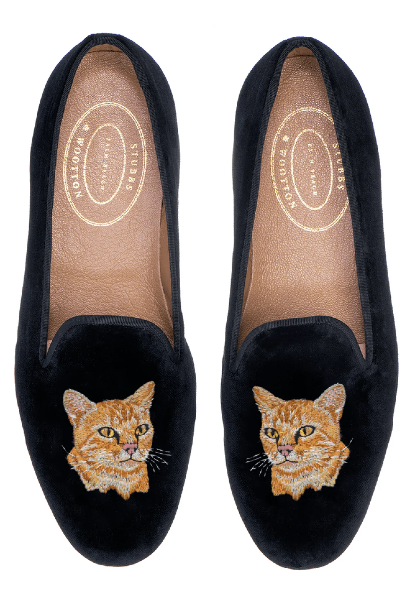 Exclusively Made-to-Order, we have released a playful collection of styles featuring our favorite canine u0026amp; feline friends. Our Tabby Cat (Orange) Velvet Slipper features the finest Black Cotton-Velvet Upper with a Black Grosgrain Trim. Meticulously Hand-crafted in Spain. Leather lined to provide additional support and comfort. The stacked wooden heel is .75 inches in height. Leather soled. True to American sizing.