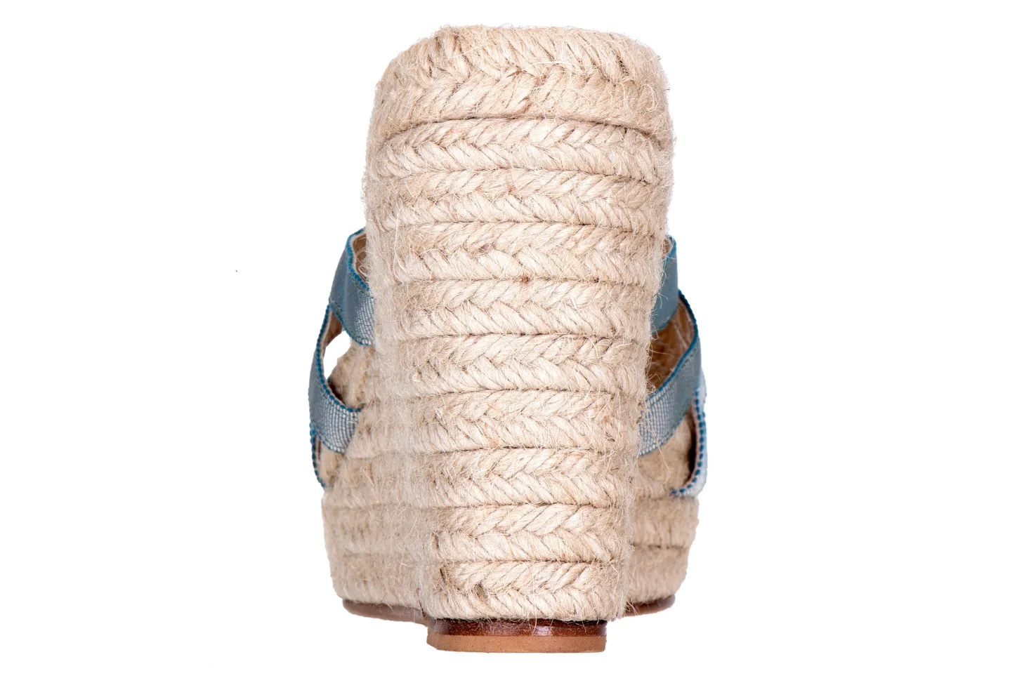 Our Grace Rib Jeans Espadrille features a Blue Grosgrain Ribbon and Jute Sole. Meticulously Hand-crafted in Spain. The heel is 5 inches in height. Leather soled. True to American sizing. If you wear a half size typically, go to the size up.
